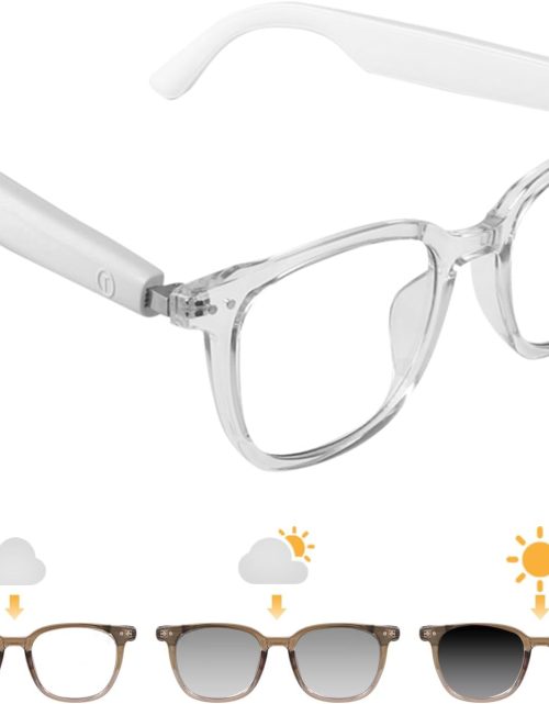 Smart Glasses for Women Men, Bluetooth Glasses with Photochromic Lenses Touch Control Voice Assistant for Clear Audio Remote Photography, Transparent frame and white legs, Perfect for Indoor Outdoor